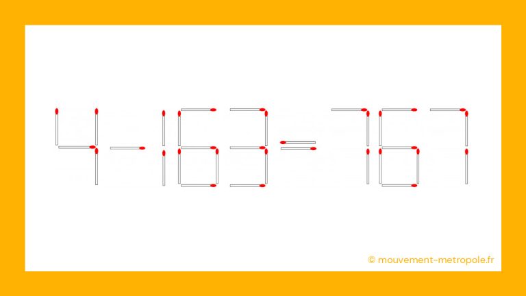 Défi mathématique : Osez-vous déplacer une seule allumette pour transformer 4 – 163 = 767 en équation correcte en moins de 30 secondes ? il y a 2 ans